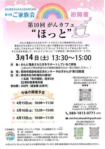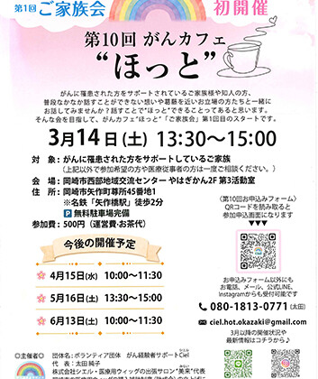 3月9~15日のイベント がん患者支えるご家族会開催 がん経験者サポート Ciel がんカフェを開催中 3月14日やはぎかん がん経験者サポートCiel(シエル)が3月14日、10... 2026.02.13