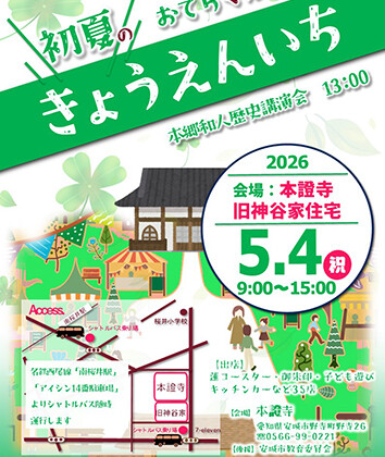 4月27日~5月6日のイベント お寺マルシェ「初夏のきょうえんいち」 5月4日 安城市野寺町の本證寺 お寺マルシェ「初夏のきょうえんいち」が、5月4日午前9時~午後3時、安城市野寺町の本證寺境内・... 2026.04.10