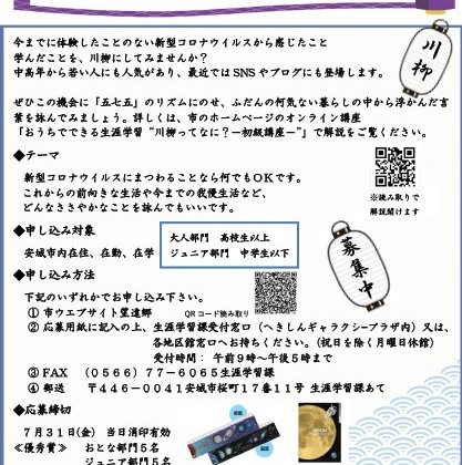 「新型コロナウイルス」テーマに、7月31日まで 安城市生涯学習課は、新型コロナウイルスにまつわるオリジナル川柳を募集しています...