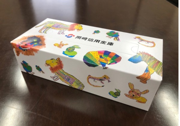 岡崎信金のボックスティッシュ 豊田高等特別支援学校の生徒七人が描いたイラストが、岡崎信用金庫(岡崎市)のボックスティッシュの絵...