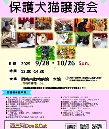 9月28日 岡崎南動物病院 「西三河ドッグ&キャット」が9月28日、保護犬&保護猫の譲渡会を、岡崎南動物病院で開催します。参加...