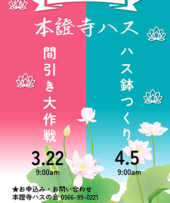 3月22日 蓮根を間引きし、持ち帰りできます 安城市野寺町の本證寺で、3月22日午前9時から、過密になった蓮根を間引きします。...