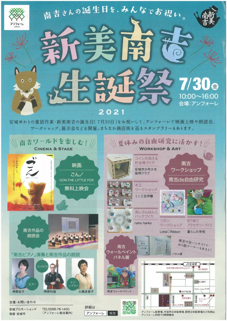 アンフォーレで「南吉生誕祭」 2021.07.28 7月30日、朗読会や展示、映画上映など 安城ゆかりの児童文学作家・新美南吉の生誕108年にあたる7月30日に、安城市御幸本町のアンフォーレで「新美南吉生誕祭」が開かれます。 映画「ごん」の無料上映会や南吉作品の朗読会、蓄音機コンサート、南吉グッズの販売、南吉ワークショップ「南吉de自由研究」など、様々な催しで生誕を祝います。午前10時~午後4時。 Tweet イベント, 安城 アンフォーレ, 安城ホームニュース, 新美南吉生誕祭 関連記事一覧 出前・宅配・テイクアウトの店舗情報掲載 2020.06.13 安城・北明治で4月1日に「桜まつりご縁市」開催 2023.03.30 安城で新聞ちぎり絵移動教室スタート 2022.11.14 「日吉山王社本殿」屋根葺替工事見学会 <岡崎> 2020.09.06 安城の“おいしい”を名古屋でPR 2023.08.09 本證寺のハスの〝密〟を防ごう 2021.04.04 安城で若手芸術家の作品展 2022.12.27 安城のまちづくり団体交流会 2023.05.25