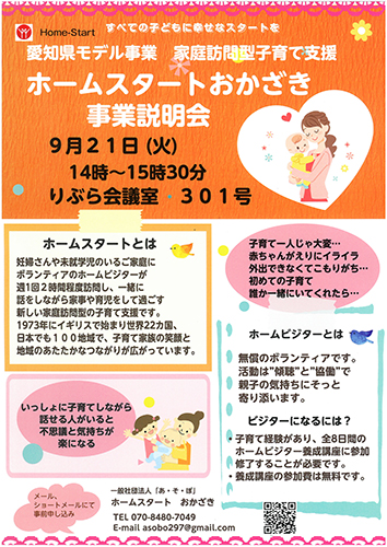 家庭訪問型子育て支援「ホームスタート おかざき」を岡崎市内で5月から始めている一般社団法人「あ・そ・ぼ」が9月21日、市図書館交流プラザりぶら会議室301号で、愛知県モデル事業のホームスタートおかざき事業説明会を開催します。