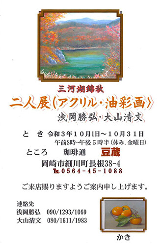二人展(アクリル・油彩画) 2021.10.18 浅岡勝弘・大山清文 細川町の豆蔵で10月31日まで ◇「二人展」(アクリル・油彩画)浅岡勝弘・大山清文 10月31日まで、午前8時~午後5時30分、細川町の珈琲通豆蔵(TEL0564-45-1088)。金曜休み。 Tweet イベントやります, ギャラリー, 岡崎 アクリル, 岡崎, 岡崎ホームニュース, 油彩, 豆蔵 関連記事一覧 和楽器の魅力を紹介 <岡崎> 2020.09.01 昭和の曲を歌い楽しむ 2025.02.25 お散歩ビンゴでまち歩き 2021.09.22 情報ランド 2025.11.10 みなくる広場deマルシェ 2022.10.17 本で親しむ「昭和100年」 2025.06.02 お寺マルシェ「秋のきょうえんいち」 2023.10.11 懐かしの“車”写生&写真作品展〈安城〉 2022.04.23