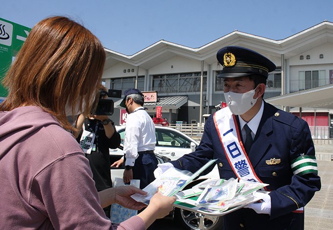 警察官の制服に身を包んだ赤星さんは交通ルールなどに関するクイズに参加し、反射材などの交通安全啓発グッズを配布。「現役時代、他の選手の動きに注意を払いながら自分の守備を固めた。車の運転も同じ。前方向だけでなく周りをよく見て。事故は交通安全を意識することで減るはずです」