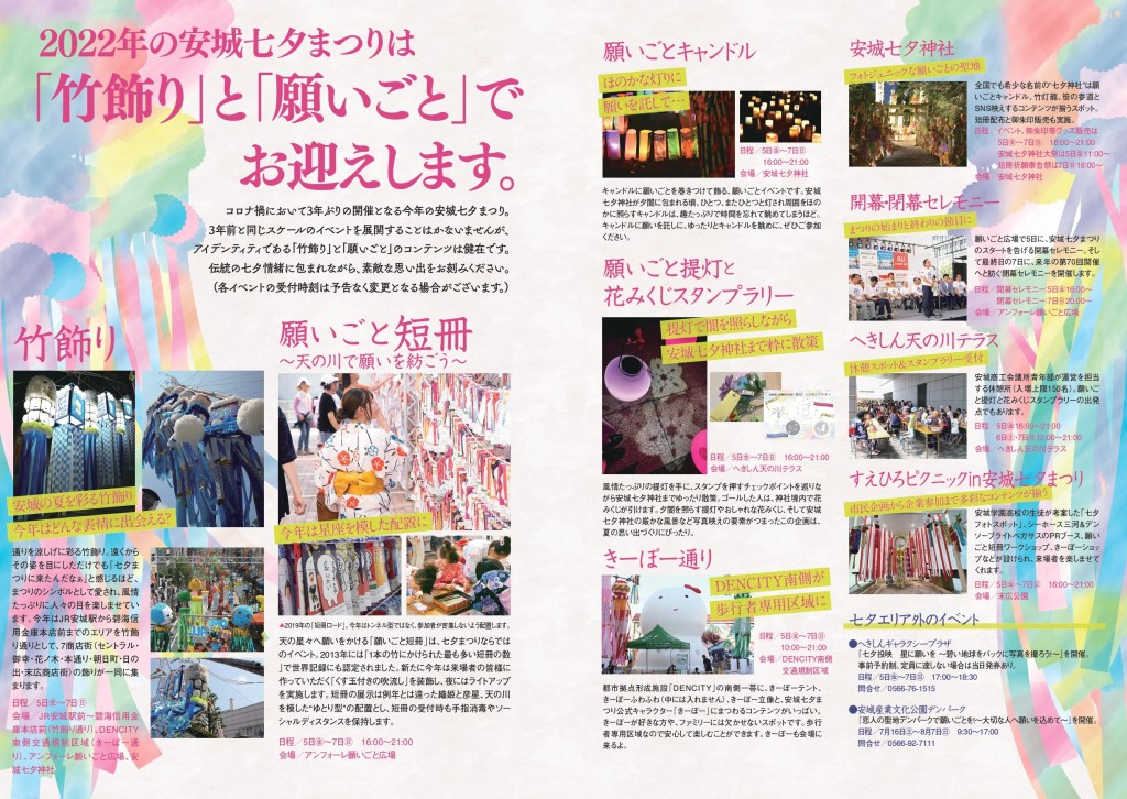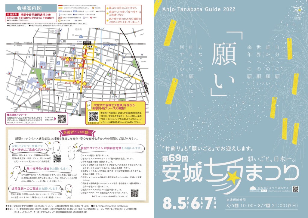 安城七夕まつりのお供に 2022.08.05 リーフレット配布と公式HPにショップマップ掲載 【会場の様子】 69回目を数える安城の夏の風物詩「安城七夕まつり」(まつり協賛会など主催)がきょう8月5日、JR安城駅前エリアで開幕しました。8月7日まで。 会場案内図や事業内容などをまとめたリーフレットを会場などで配布。安城七夕まつり公式サイトからもダウンロードできます。 今年は露店の出店がないため、同サイトには地元の飲食店情報「ショップマップ」も掲載されています。 【会場などで配布されているリーフレット】 Tweet 催し, 安城 安城ホームニュース, 安城七夕まつり, 安城七夕まつり協賛会, 安城市 関連記事一覧 ウルティマ・トゥーレ -18- 2021.03.08 納涼音楽祭 in 中山神明社 2020.07.08 手作りマスクの寄付を呼び掛け 2020.06.09 安城市交響楽団 クリスマスに定期演奏会 2021.12.12 安城市民活動センターでフードドライブ 2022.12.21 24日 岡崎でシェアフルマルシェ 2023.09.16 木目込み人形作家の実演 2022.01.06 新しいトラックで快走 安城小中学生短距離走大会 2021.04.06