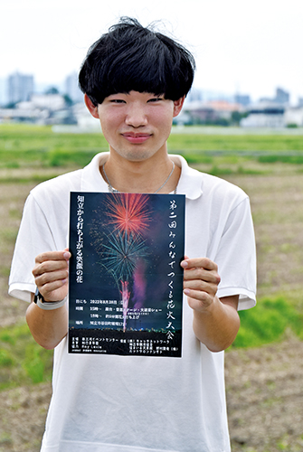 イベントの企画・運営をする「西三河イベントセンター」の太田純平代表(19)が8月28日、谷田町の谷田神明社近くで「第2回みんなでつくる花火大会~知立から打ち上がる笑顔の花」を行います。午後7時~7時10分。