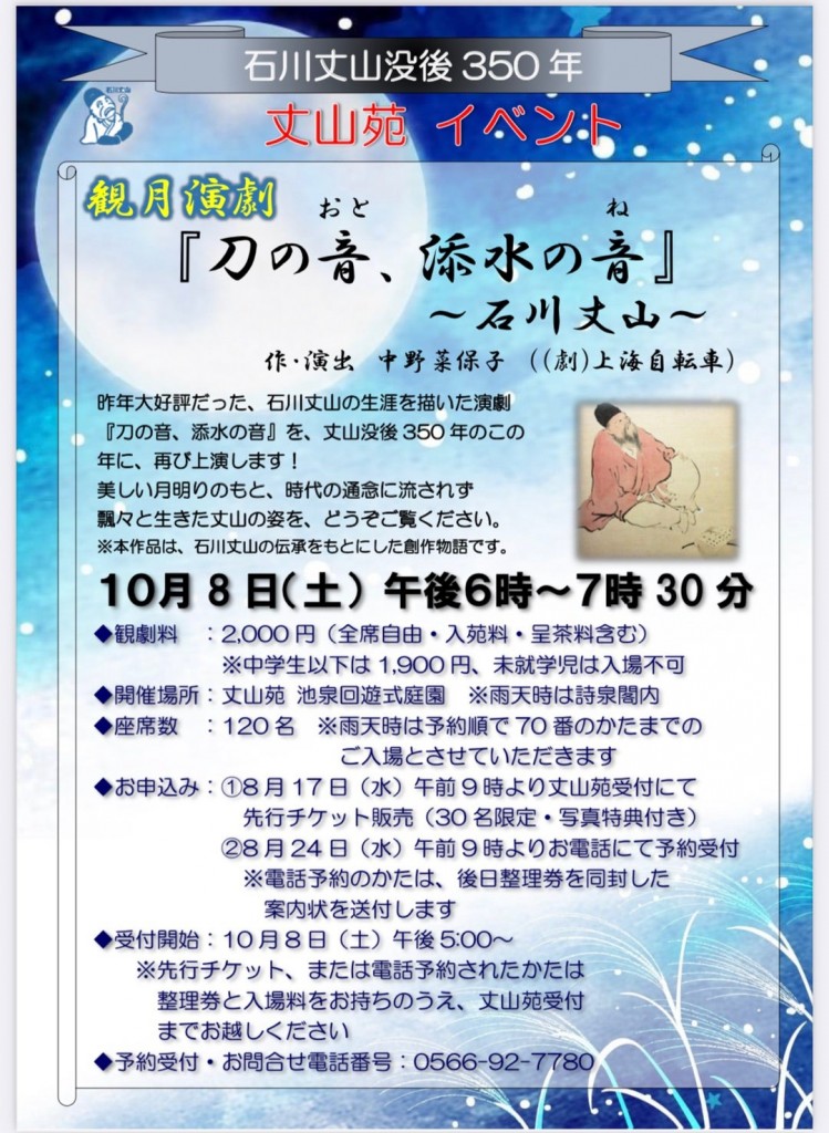 安城市和泉町の丈山苑で10月8日午後6時から、演劇・映像制作ユニット「(劇)上海自転車」による観月演劇「刀の音、添水(そうず)の音(ね)~石川丈山」が再演されます。