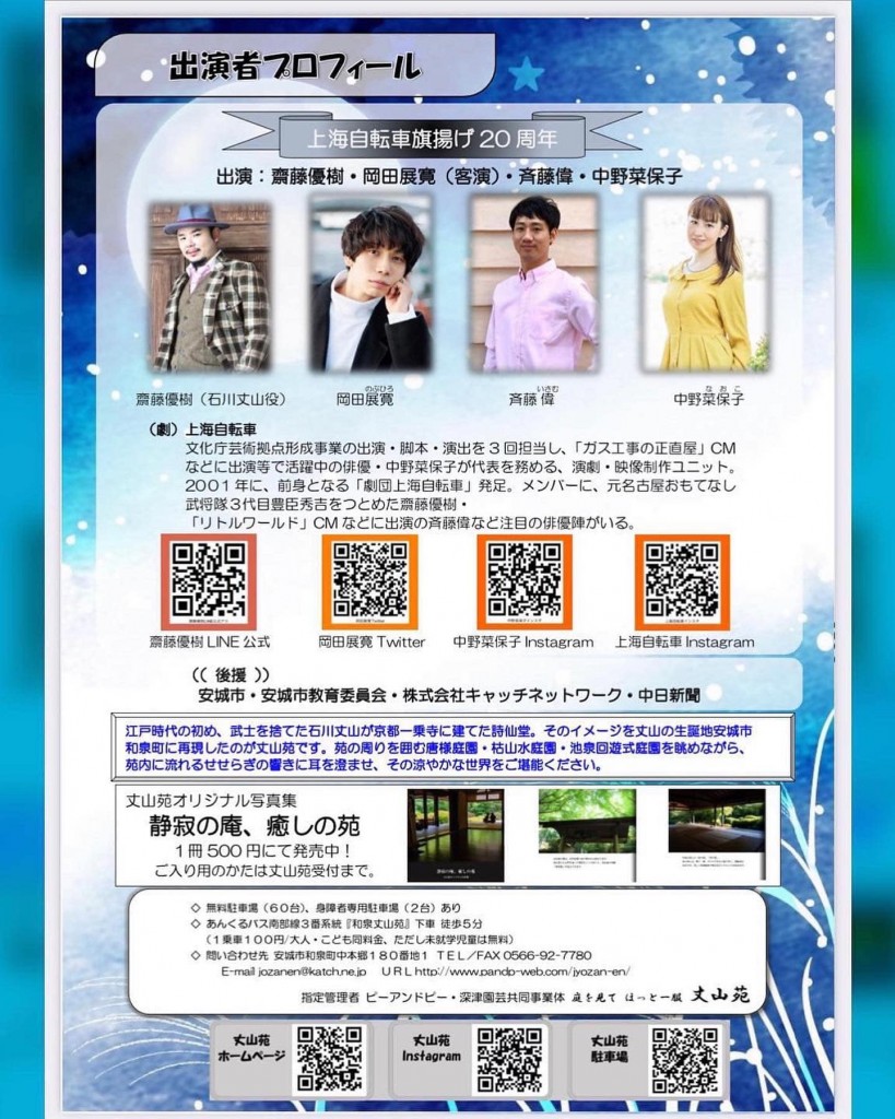 徳川家康の家臣だった同町出身の丈山が、武士の身分を捨て、多才な文人として悠々自適に生きた姿を描いたオリジナル作品。上海自転車代表の中野菜保子さんの作、演出で、丈山役は名古屋おもてなし武将隊で3代目豊臣秀吉役を務めた齋藤優樹さん。客演に岡田展寛さんを迎え、安城市出身の俳優・斉藤偉さんも出演します。