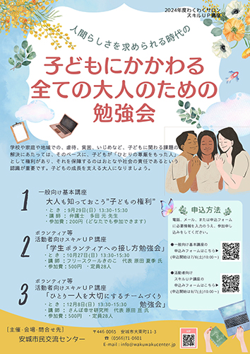 ◆わくわくサロンスキルUP講座子どもにかかわる全ての大人のための勉強会「大人も知っておこう〝子どもの権利〟」 9月29日午後1時30分~3時30分、安城市民交流センター=大東町=。一般向け基本講座で、講師は弁護士の多田元さん。参加費200円。(問)同センターTEL0566-71-0601