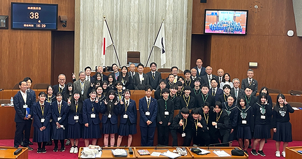知立高校と知立東高校の生徒35人が、12月24日、市役所本会議場で行われた「高校生議会」に参加し、知立市議会議員19人を前に、〝高校生目線”の6議案を発表しました。