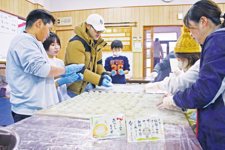 各地でボランティア活動を続ける会社員、川路和洋さん(58)=東境町=の呼びかけに、小学生から60代までの30人が参加。石臼で餅米72升分の餅をつき、手で丸めたり麺棒で伸ばしたりして、丸餅やのし餅を作りました。