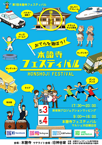 「お寺を遊ぼう!第7回本證寺フェスティバル」が、5月4日午前9時~午後4時に、野寺町の本證寺と旧神谷家で開催されます。3日午後5時30分~8時は、前夜祭プロジェクションマッピング。参加無料。