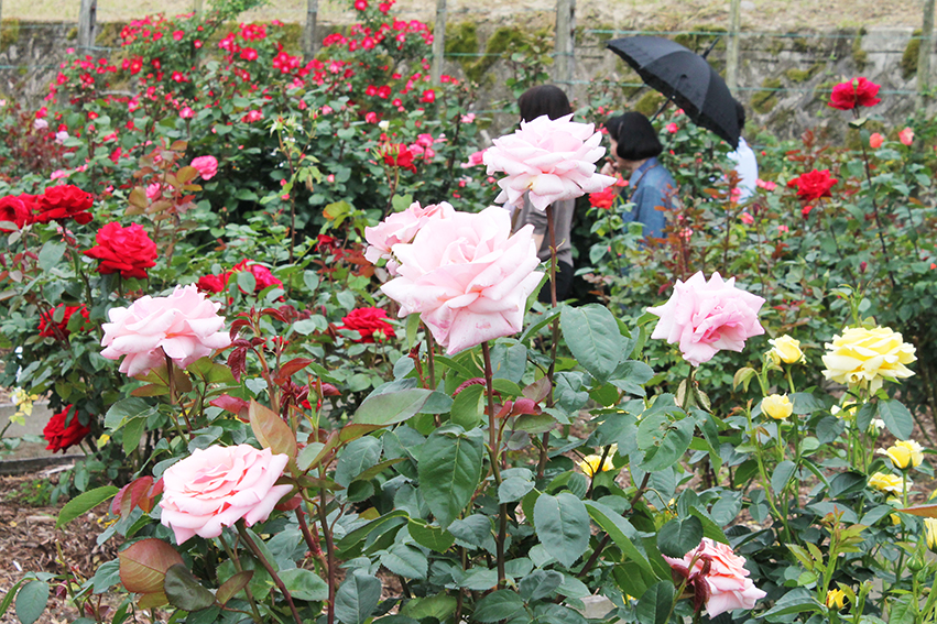 バラ園には、約100種1000株が植えられており、赤、白、黄、ピンクなど、色とりどりの多品種のバラが競演。訪れた人たちが「きれい」と口ずさみ、スマートフォンで撮影する姿も見られます。花は6月中旬まで楽しめそうです。