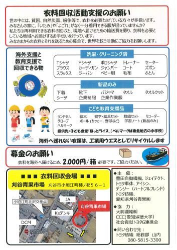 海外支援衣料回収 2025.06.23 2025年7月6日「刈谷青果市場」(愛知県刈谷市小垣江町)で開催 午前10~午後1時 Tweet イベントやります, 刈谷 刈谷ホームニュース, 刈谷市, 刈谷青果市場, 安城ホームニュース, 安城市, 海外支援衣料回収, 特定非営利活動法人日本救援支援衣料センター, 知立, 知立くらしのニュース, 知立市, 碧南市, 髙浜 関連記事一覧 handcraft club 心遊草 展示会・即売会 2025.10.02 中日新聞社主催オンライン講演会 第3弾 2022.10.06 デンソーG 技能五輪でメダル獲得 2021.12.22 近藤正治さん回顧展 市原稲荷神社で7月7日から 2024.06.29 「夢をかなえるちから」 2022.12.09 町ぶら刈谷百景(6) 2021.06.24 こいのぼり 天高くスイスイ 2022.04.24 刈谷市歴史博物館が10万人達成 2021.08.28