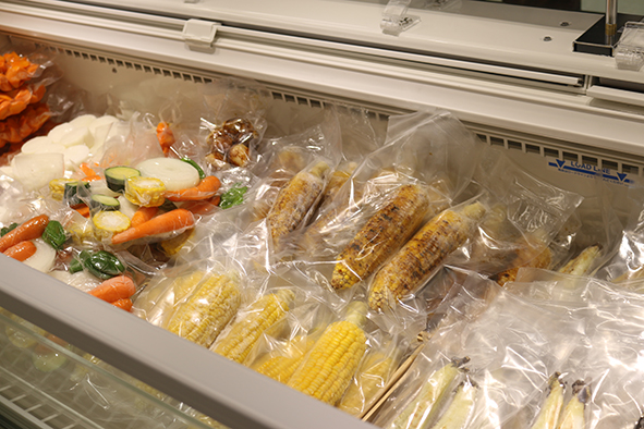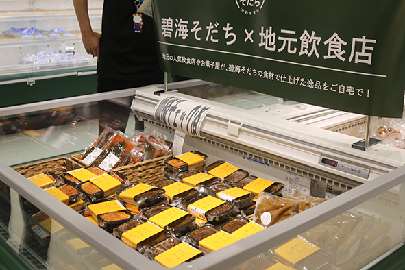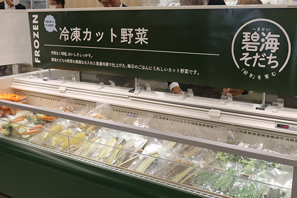 碧海そだちの「冷凍カット野菜」コーナーには、手間のかかる下ごしらえなどが済んだ調理済みの野菜が豊富にそろい、地元飲食店が碧海そだちの野菜を使用して作ったハンバーグやパスタなどの冷凍品も販売しています。