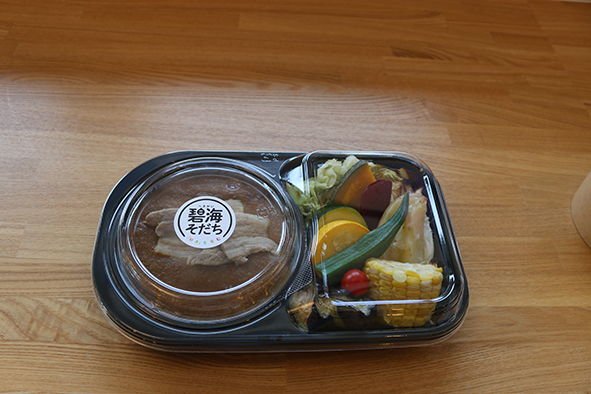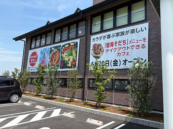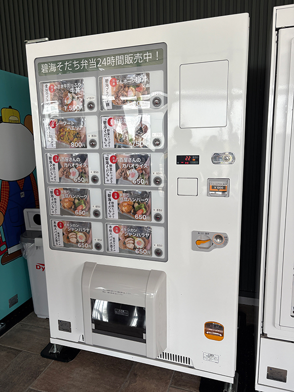 店舗入り口前では野菜をたっぷりと使用した「碧海そだち弁当」の冷凍自動販売機や、農作物の冷蔵自動販売機(7月1日から)があり、24時間販売します。