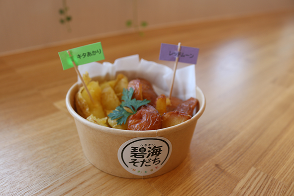 はたけのカフェでは、碧南特産のニンジン「へきなん美人」をペーストにし、旬の野菜を添えた「やさい畑カレー」(800円・ごはんは別売り)や、品種の違うイモの食べ比べができる「旬のいもくらべ」(380円)の他、「旬のやさいクレープ」(400円)などが楽しめます。いずれも、野菜は地元産の旬にこだわり、時期によって変わるのも楽しみ。