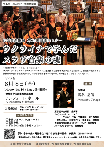 毎回、さまざまなな演奏家や音楽専門家を講師として招いている、安城音楽協会が主催の「音楽セミナー」。21回目のテーマは「ウクライナで学んだスラヴ⾳楽の魂〜⾳楽がつなぐ『いのち』と『こころ』~」です。