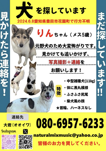 2024年6月8日から迷子になっている雑種犬りんちゃんを、ずっとずっと探しています。