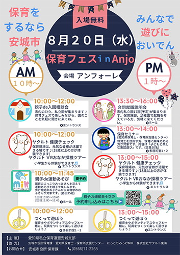 保育の魅力がまるごと分かるイベント「保育フェス in Anjo」(愛知県私立保育連盟安城支部主催)が8月20日午前10時から午後3時まで、アンフォーレで開催されます。入場無料。