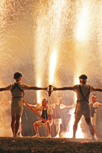 各町の若衆約10人が、火薬を詰めた竹筒を手に円陣を組み、一斉に点火。ごう音とともに炎が7㍍以上にも噴き上がり、秋の夜空を照らします。