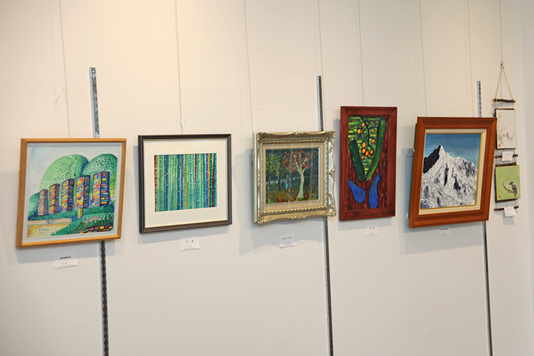 風景や静物など、メンバーそれぞれが描きたいものを、使いたい画材で表現した、色とりどりの作品が並びます。