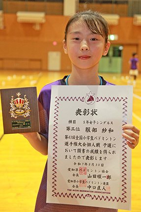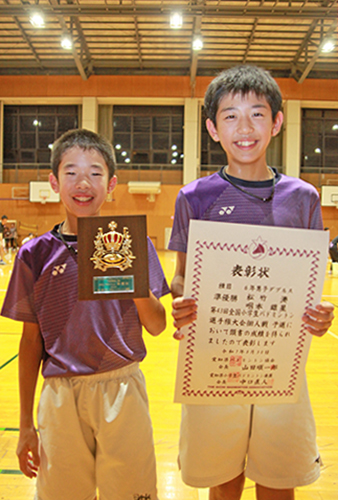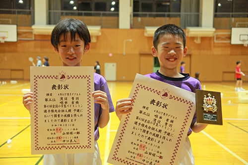 岡崎新大さん(六ツ美北部)と中嶋優仁さん(福岡)ペアは5年男子複の部で優勝。6年同部では、咽本雄星さん(井田)と松竹湊さん(六ツ美北部)が準優勝。4年以下同部で、咽本吉稀さん(井田4)と渡辺青羽さん(安城東部3)が3位。東海大会でも勝ち上がって、全国大会への切符を手に入れようと、コートでラケットを振り続けます。