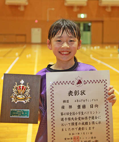 齋藤日向さん(豊田・畝部4)は4年以下女子単の部で優勝。「県大会の時みたいに、集中をとぎらせず、3位までに入りたい」と意気込みます。