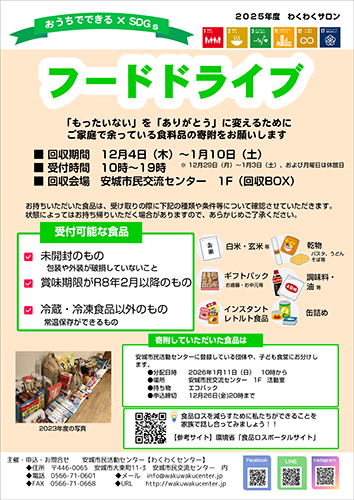 安城市民交流センター=大東町=で、12月4日から1月10日まで、「フードドライブ食品寄附」を行います。