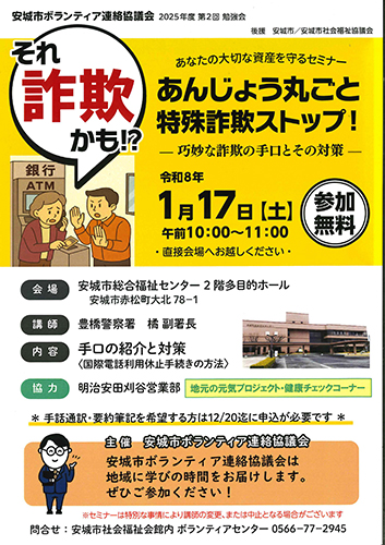 安城市ボランティア連絡協議会が2026年1月17日午前10時から、「あんじょう丸ごと特殊詐欺ストップ!」を、同市赤松町の市総合福祉センター2階多目的ホールで、開催します。11時まで、参加無料。