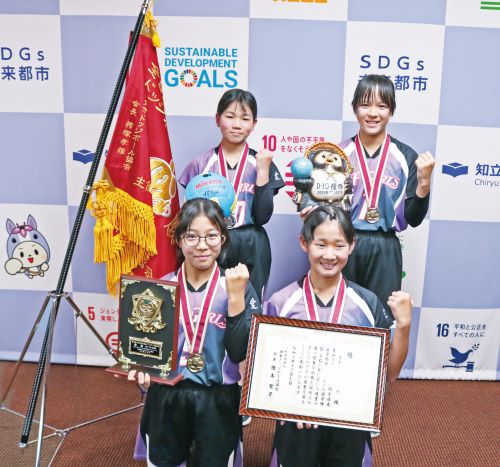 知立市を拠点にするドッジボールチーム「知龍リトルマジック」からは、小林桃菜さん(猿渡小5年)、碇山杏実さん(知立南小5年)と山田楓空さん(豊田市・6年)、山田彩楓さん(同)が出場。4人は「他のメンバーともすぐ仲良くなれた。互いを思いやり助け合ったプレーが、優勝につながった」と口をそろえます。
