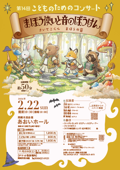 岡崎市民会館=六供町出崎15番地1=あおいホールで2月22日、第14回こどものためのコンサート「まほう使いと音のぼうけん 聞いてごらん まほうの音」が開催されます。午前10時30分開演(10時開場)、公演時間は約50分。