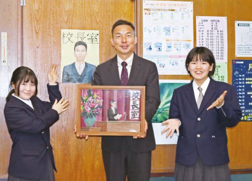 愛知県知立市立知立中学校の校長室を彩る「特別な飾り」。美術部1年の杉浦日向子さんと衣川朱海さんが描いた村山由久校長の似顔絵が飾られています。