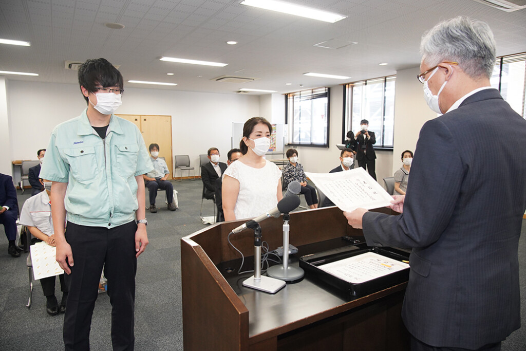 稲垣武市長が各事業所の担当者らに表彰状を手渡しました。最高得点を獲得したシミズ工業=同市一ツ木町=の総務人事課の女性従業員は「健康経営に力を入れて3年目。普段やっていることが評価されてよかった。特に力を入れているのが二次健診率の向上。今後は特に予防という観点から高い意識を持ち、社員が笑顔で健康に過ごしていけたら」と話していました。