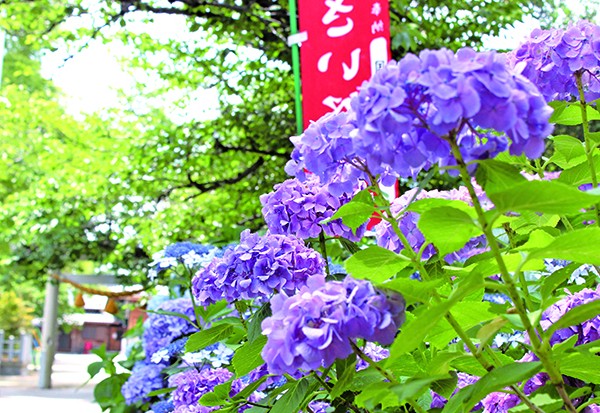 碧南のあじさいの名所として知られる「斎宮社」=碧南市千福町3-3。参道や境内には紫や青、白色のさまざまな品種のアジサイが咲いて...