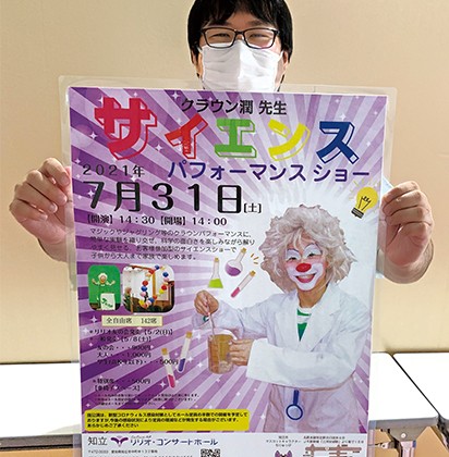 クラウン潤先生が楽しく実験 笑いと驚きがいっぱいの「サイエンス パフォーマンスショー」が31日、リリオ・コンサートホールで開か...