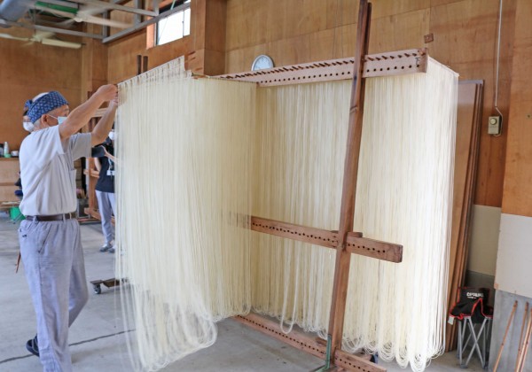 2本の棒を操り約3.6メートルに 安城市特産の「手延べそうめん」作りが繁忙期を迎えています。同市和泉町の「間杉手延製麺所」の作...